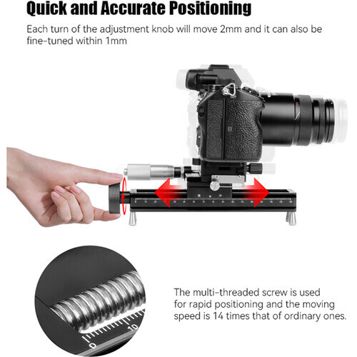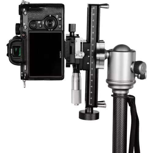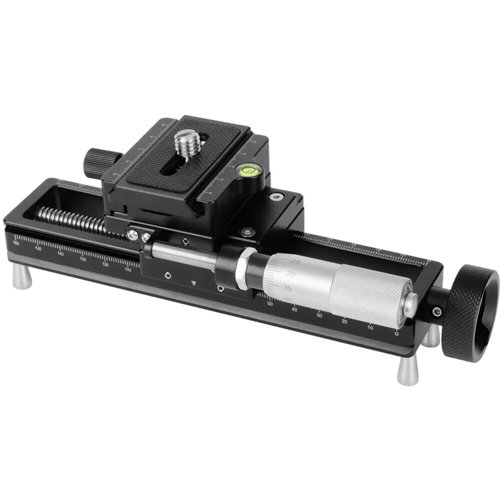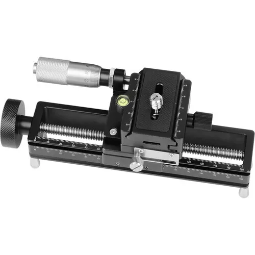 AstrHori'nin AH-MGA170 Makro Odaklama Rayı Sürgüsü, yüksek çözünürlüklü görüntüler elde etmek için bir makro lensle birlikte kullanılabilir. Kamera pozisyonunu hassas bir şekilde ince ayarlamak için entegre bir mikrometre mekanizmasına sahiptir. Mikrometre ayar düğmesi, dönüş başına 0,05 mm hareket sağlar. Ana ayar düğmesi, hızlı konumlandırma için dönüş başına 2 mm hareket sağlar. Mekanizma, açılı veya dikey yöndeyken kamera hareketini önlemek için sönümlemeye sahiptir. Farklı odak noktalarıyla fotoğraf çekmek ve odak istifleme uygulamaları için ideal bir araçtır.