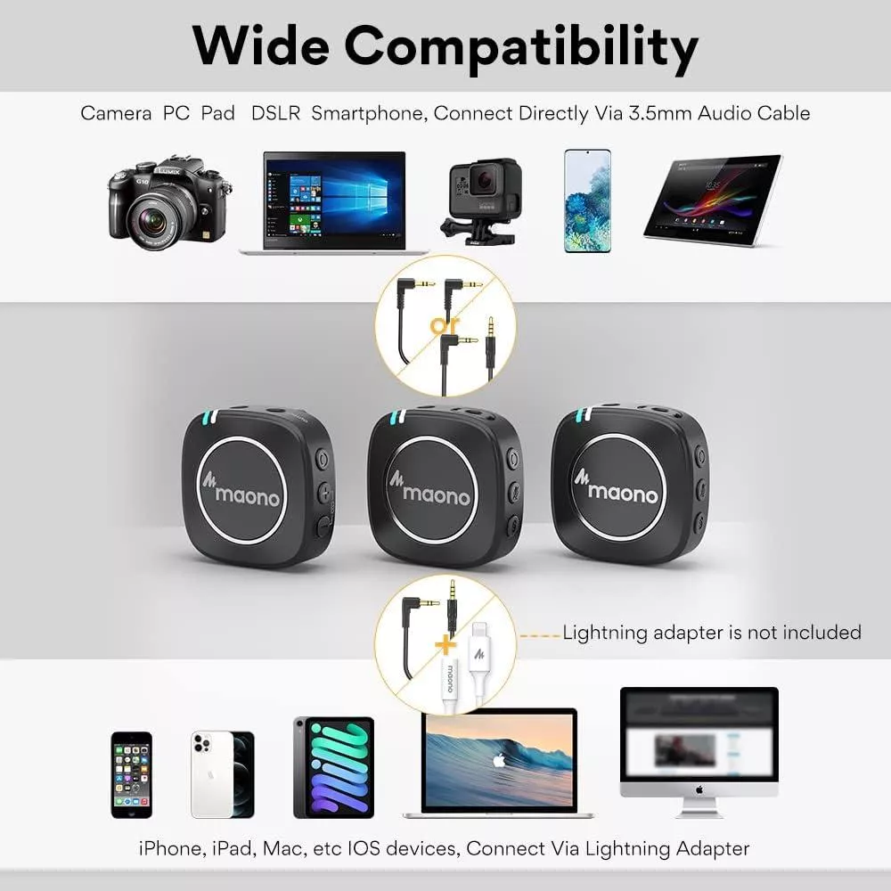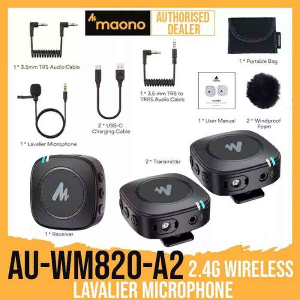 MAONO AU-WM820A2 Dual Kablosuz Yaka Mikrofonu, 2 verici (TX1/TX2) + 1 alıcıdan (RX) oluşan 2.4 GHz “çift kişilik” kablosuz yaka mikrofon seti. Röportaj, vlog, canlı yayın, eğitim çekimleri gibi iki kişinin aynı anda konuştuğu senaryolar için tasarlanmış.