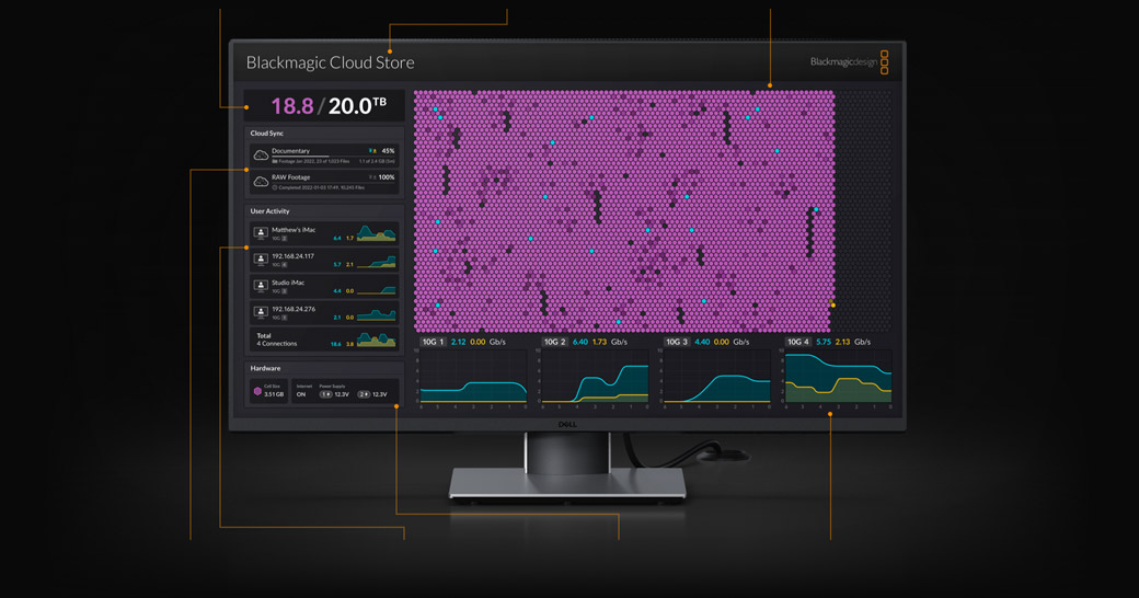 En kullanışlı özelliği, HDMI monitör çıkışıdır! Blackmagic Cloud Store'nin durumunu gerçek zamanlı görmek için, bir TV veya monitör bağlamanız yeterlidir. Depolama planı; hafıza çekirdeğinin grafik bir temsilini ve bağlı kullanıcılar için okuma ve yazma erişiminin gerçekleştiği yeri gösterir. Bu ekranı izlemesi oldukça hoştur! Ayrıca, dört ana 10G Ethernet bağlantısı üzerindeki veri transferlerini gösteren, dört grafiği de var. Ana alan göstergesi, hafıza çekirdeğinin kapasitesini ve o an ne kadarının kullanıldığını gösterir. Ayrıca depoya özel bir isim bile ekleyebilirsiniz! Her bir Dropbox bağlantısı için durum da gösterilir. Bağlı olan kullanıcıları ve güç kaynağı durumunu görmek bile mümkündür.