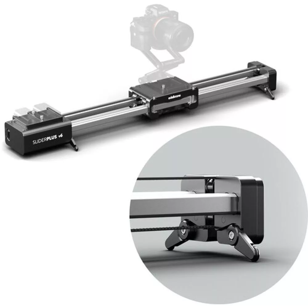 SliderPLUS serisinin farkı, rayların kamerayla birlikte hareket etmesi. Klasik slider’larda ray sabittir, kamera rayın üzerinde ileri–geri gider. SliderPLUS v6’da ise ray sistemi kamera ile beraber hareket eder; böylece slider gövdesi kısa kalırken efektif kaydırma mesafesi iki katına çıkar.
