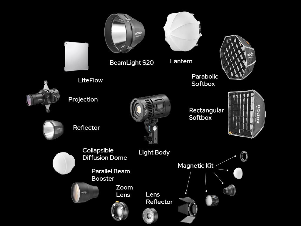 Mikro-Optik Lens Aksesuarları Manyetik KitManyetik kit, Godox’un mikro-optik tasarımına sahiptir ve lens reflektörlerle birlikte çalışarak ışık alanını ve yayılma açısını kontrol etmenizi sağlar.