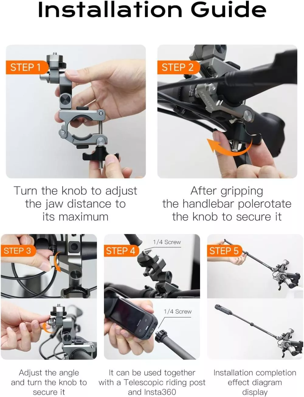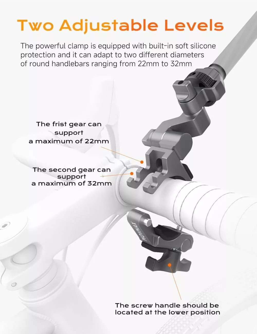 İki adet ayarlanabilir kelepçe 22-32mm aralığındadır ve piyasadaki çoğu yuvarlak borulu gidonla uyumludur. Ürün 226g ağırlığında olup taşıması kolaydır. Her biri 30° olan altı farklı ayar konumu sayesinde 360° serbestçe döndürülebilir; bu özellik, tüm çekim ihtiyaçlarınızı karşılarken sık kullanılan kafa ve göğüs bağlantı aparatlarının yarattığı zahmeti ortadan kaldırır.