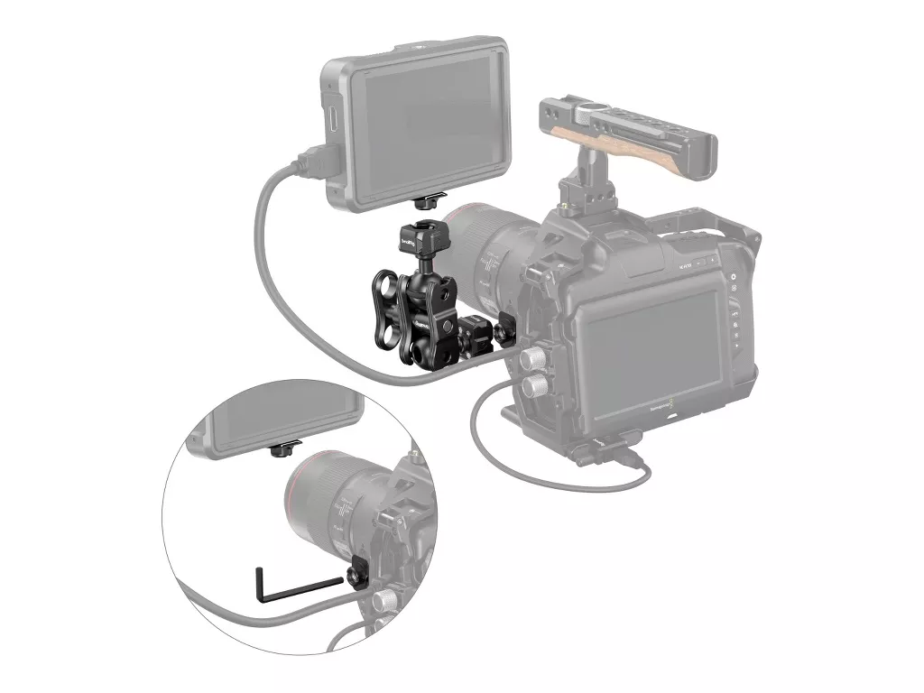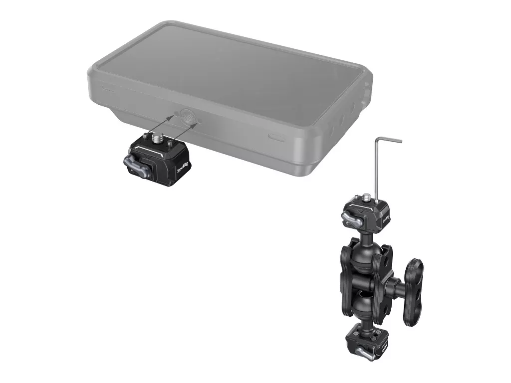 Hızlı Çıkarmalı Bilyalı Başlı SmallRig Sihirli Kol 3515C, her iki ucunda 1/4"-20 dişli vida yuvaları bulunan, sürtünmeyi artıran ve çizilmeleri önleyen yastıklara sahip hızlı çıkarılabilir bir montajdır. Hızlı çıkarılabilir bilyalı başlığı, kameralar, monitörler, kafesler, montaj plakaları vb. gibi 1/4"-20 dişli cihazlarla uyumludur ve hızlı çıkarılabilir plaka, taban plakasına dikey ve sabit bir şekilde takılabilir ve sapmaya neden olmaz. Sihirli kolun kilitlenmesi ve kilidinin açılması kolaydır. Bilyalı başlık, bir kelepçeyle birlikte, sihirli kolun evrensel olarak ayarlanmasını sağlar. Çıkarılabilir ve değiştirilebilir. 2132, 2133, 2134, 2114, 2108, BUM2383 ve 2211 aksesuarlarıyla uyumludur, ihtiyaçlarınıza göre yukarıdaki aksesuarları seçebilirsiniz. 5 kg'a kadar tutabilen bu sihirli kol, çekim sırasında cihazları güvenli bir şekilde kilitler.