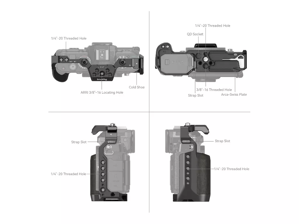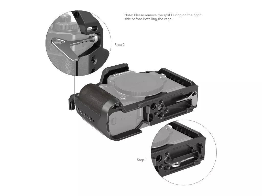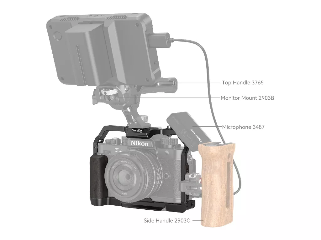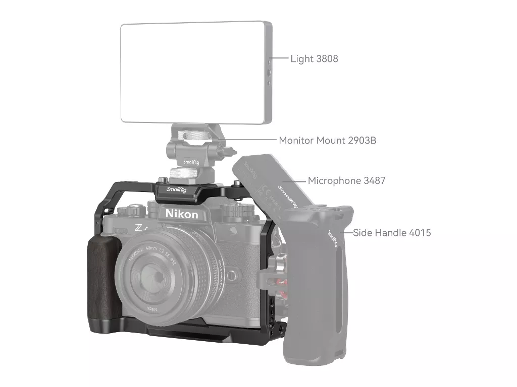 SmallRig Cage for Nikon Z f 4261, kamerayı korumak, aksesuarları takmak ve tutuşu iyileştirmek için tasarlanmıştır. Altta bir adet 1/4“-20 vida ve sağda bir adet M2.5