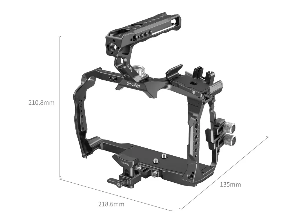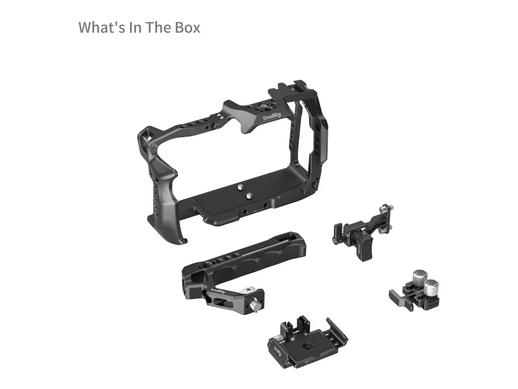 ve birden fazla aksesuar genişletme seçeneği sunmak için tasarlanmıştır. Kit, bir kafes, bir üst tutamak, bir HDMI ve USB-C kablo kelepçesi, bir SSD montaj braketi ve bir lens adaptörü desteği içerir. Üç noktalı kilitleme sistemi, kamerayı tabanda iki adet 1/4"-20 vida ve üstte bir adet 1/4"-20 vida ile sabitlerken, entegre silikon pedler çizilmeyi önler. Kafes, tüm kamera arayüzlerine, kart yuvalarına,açılır ekrana ve pil bölmesine engelsiz erişim sağlar. Lens adaptörü desteği Sigma MC-31, Sigma MC-21 vb. lens adaptörleriyle uyumludur ve kameranın montajınınhasar görmesini önler. Kit ayrıca kameranın portlarını korumak ve sinyal kaybını önlemek için HDMI ve USB-C kablo kelepçeleriyle donatılmıştır. Ergonomik ARRI tipi üsttutamak, içerik oluşturucular için rahat bir düşük açılı çekim deneyimi sunarakkamerayı tutmayı kolaylaştırır. SSD montaj braketi, Samsung T5/T7 SSD'lerle uyumludur ve hızlı montaj ve sökme için dahili bir flaş kızağına sahiptir. 1/4"-20 dişli delikler, 3/8"-16 dişli delikler, ARRI konumlandırma delikleri, soğuk yuva montajları, NATO rayı ve QD montajları gibi birden fazla montaj seçeneğiyle kit, sihirli kollar, yan tutamaklar, üst tutamaklar çubuk kelepçeleri, taban plakaları, LED video ışıkları, mikrofonlar ve daha fazlası gibi aksesuarları barındırır.