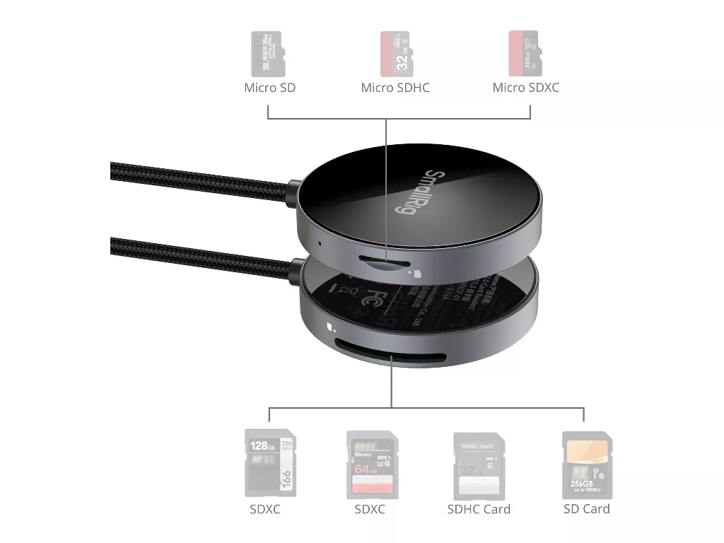 Micro SDXC ve Micro SDHC dahil olmak üzere çeşitli bellek kartlarını destekler ve SD ve TF kartlarının aynı anda okunmasına ve yazılmasına olanak tanır. Bu özellik,