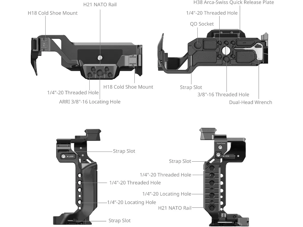 Panasonic LUMIX S1R II / S5 II / S5 IIX / G9 II 4902 için SmallRig Kafes, aksesuarları takmak ve kamerayı korumak için tasarlanmıştır. Kamerayı bir alt 1/4"-20 vida ve iki yan kilitleme adaptörü ile kilitler ve çizilmeleri önleyen kauçuk pedler bulunur. Aksesuar montaj noktaları arasında, 1/4"-20 delikler ve ARRI 3/8"-16 yerleştirme delikleri, kolay kamera hareketi ve daha fazla denge için Üst Sap 2165C, Yan Sap HSN2093C vb. destekler; ve üst ARRI 3/8"-16 yerleştirme deliği Monitör Montajı 2903B'ye uyar. Ayrıca mikrofonu, bir LED video ışığını takmak için iki adet flaş kızağı vardır; Üst Sap 4483 için bir üst NATO rayı; Yan Sap 4485 için bir sol NATO rayı; ve bir QD omuz askısı takmak için bir alt QD soketi ile birlikte gelir. Alt kısımda DJI RS 2/ RSC 2 / RS 3 / RS 3 Pro / RS 4 / RS 4 Pro gimbal ve Arca-Swiss tripod'lara uygun bir Arca-Swiss hızlı çıkarma plakası ve Arca-Swiss Hızlı Çıkarma Plakası 3154 için dişli bir delik bulunmaktadır. Üründe ayrıca, El Askısı 3848, Omuz Askısı PSC2428 vb. ile uyumlu, her iki tarafta ve altta kayış delikleri bulunur. Ayrıca, kolay sökme ve takma için manyetik bir anahtar da dahildir.