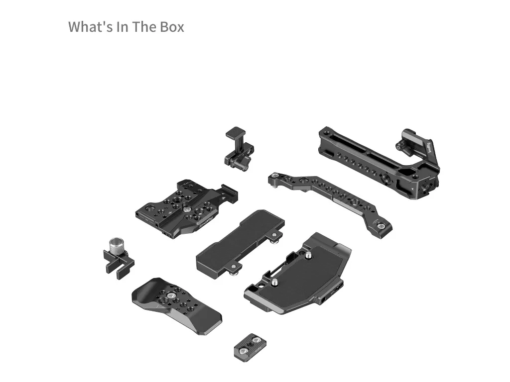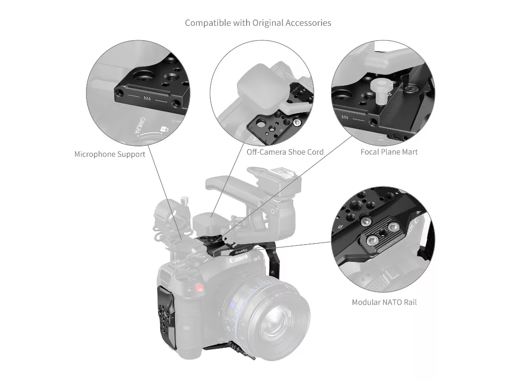 delikleri, M3 dişli delikler, flaş kızakları, H21 NATO rayları ve QD soketleri) yan kulplarla (ID 3260, 4015, 4016), sihirli kollarla (ID 5141, 4194, 3873, 3959), monitörmontajlarıyla (ID 4487, 2906B, 2903B, 2905B), çift çubuk kelepçeli taban plakalarıyla (ID 3357) ve odak çubuğu kelepçeleriyle (ID 3598) uyumludur. Modüler taban plakası tasarımı iki yapılandırma sunar: montaj plakası kullanıldığında, tripodlara (ID 4463), ARRI BP8 taban plakalarına (ID 3357) ve omuz düzeneklerine (ID 4181) monte edilebilir. Montaj plakasının çıkarılması, DJI RS 2, RS 3 Pro ve RS 4 Pro gimbal'lerine doğrudan montaj yapılmasını sağlar. Ergonomik sağ taraf plakası tutuşu artırır ve tripodlar (ID 4463) veya L şeklinde montaj plakaları (ID MD4360) gibi aksesuarları takmak için birden fazla dişli deliğe sahiptir. Orijinal tutacağa uyacak şekilde eşleşen oluklarla tasarlanmış modüler NATO rayı, kesintisiz yatay ve dikey çekim için kafesin üstüne ve yanlarına monte edilebilir. Bu kafes kiti Canon'un OEM mikrofon yuvaları, odak düzlemi işaretleri ve kamera dışı flaş kızağı kablolarıyla (OC-E4A) uyumludur. Lens adaptörü desteği, PL-RF gibi farklı lensadaptörlerine uyum sağlamak için 19 mm ayarlanabilir ve deformasyonu veya hasarı önlemek için kamera yuvasındaki gerginliği azaltır. Ayrıca, kitte sabit veri iletimi için bir HDMI kablo kelepçesi ve rahat bir tutuş için yerleşik kaymaz silikonlu ergonomik bir üst tutamak bulunur. Kolay montaj ve sökme için manyetik bir Allen anahtarı da dahildir.