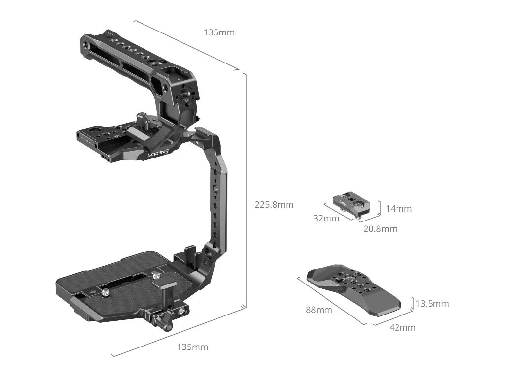 Modüler tasarımı özelleştirilebilir kurulumları desteklerken, çeşitli montaj arayüzleri (1/4"-20 ve 3/8"-16 dişli delikler, 1/4"-20 yerleştirme delikleri, ARRI 3/8" -16 yerleştirme