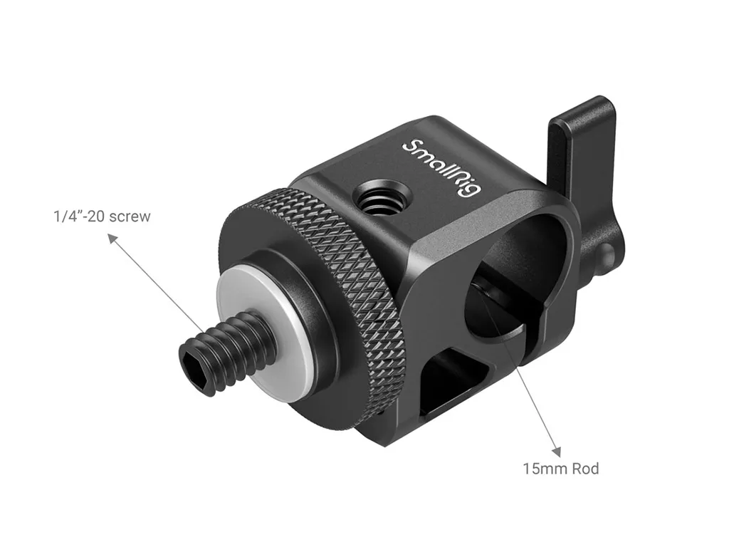Tek Ray Blok Çubuk Kelepçesi, DSLR Rig'deki herhangi bir standart 15 mm çubuğa monte edilebilir. 1/4" dişli deliğiyle birlikte gelir: dişli çapı uluslararası standart 1/4"tir.