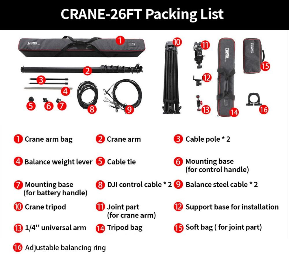 Çoğu Teris mini jib gibi, tripod tabanı/ayakları ve uygun denge ağırlıkları ayrı olarak temin edilir.